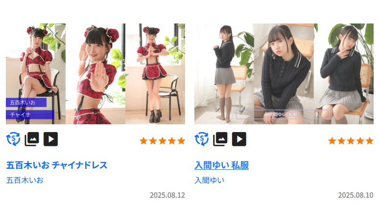 たとえば画像の五百木いおちゃんのチャイナドレスのコスの写真&動画のレビューはこんな感じ↓